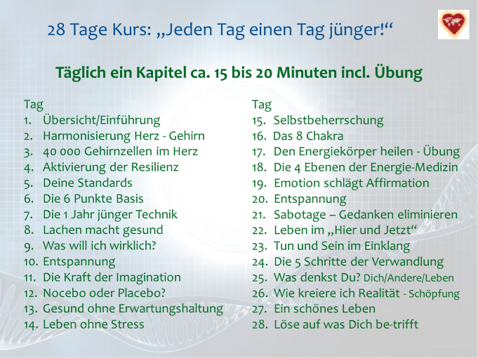 Dann entscheide Dich bitte kurzfristig um beim nächsten Kurs, der in Kürze beginnt, dabei zu sein. Du erhältst täglich den Zugang per Mail für das entsprechende Video. Die Videos dauern zwischen 15 und 20 Minuten und am Ende machen wir gemeinsam die Übung zur Herz-Gehirn-Harmonisierung. Allein durch die tägliche Übung hast Du nach 28 Tagen garantiert ein positives Ergebnis.